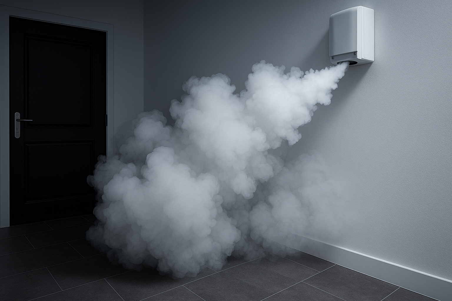🔹✦▌ نکته حیاتی: هرگز دستگاه دودزا را مستقیماً بالای سیستم تهویه یا کولر نصب نکنید. جریان هوای شدید باعث پخش نامنظم دود و کاهش غلظت آن میشود. بهتر است محل نصب در مسیر مخالف جریان هوا و در بخش مرکزی سقف باشد تا دود یکنواختتر منتشر شود.